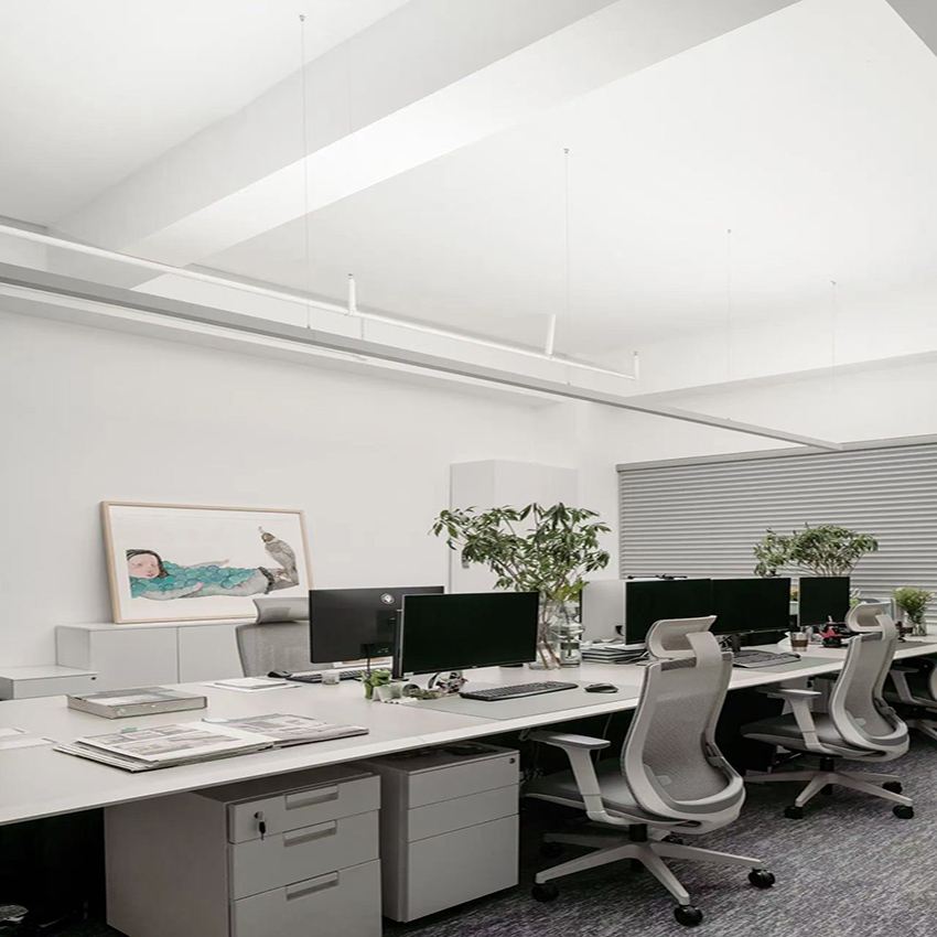 在灯光设计上,办公区使用了大角度上发光灯具,以间接光作为空间的主照明,“见光不见灯”的设计避免了设计师电子设备的屏幕反光,能同时确保工位亮度及空间均匀度。